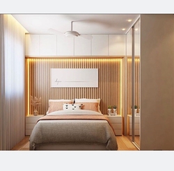 Dormitorio moderno, diseño interior, habitación principal, muebles de cama con armario y tocador