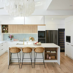 Gabinetes de cocina de lujo modernos Diseño de encimera de isla central Buena cocina de madera y gabinete de pared